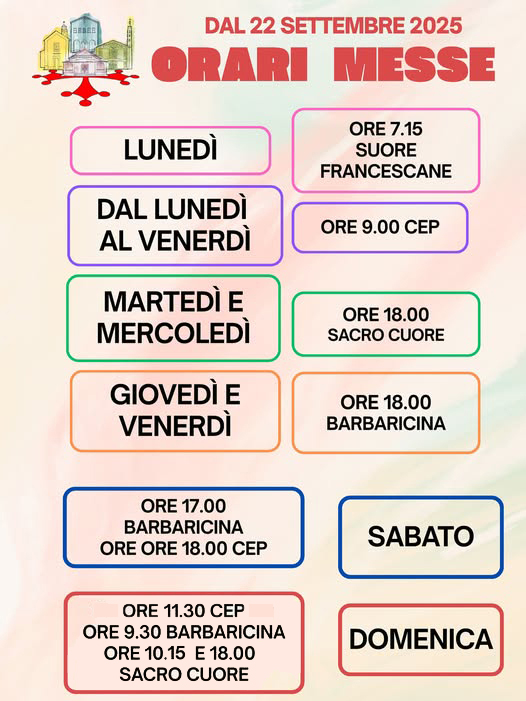 ORARIO INVERNALE DELLE MESSE 2025/26 di redazione21 Settembre 202529 Novembre 2025In Cammino - Avvisi - Notizie, Orario S. Messe Orario delle messe dal 30 Novembre 2025 al 30 Maggio 2026 Versione PDF scaricabile da qui