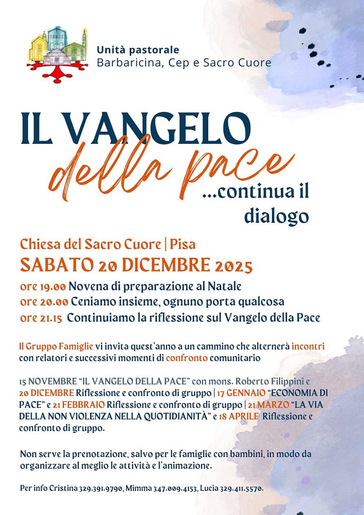 Dopo l’incontro molto interessante del 15 Novembre guidato da Mons. Filippini, che ci ha aiutato a riflettere sul Vangelo della Pace, la sera di Sabato 20 Dicembre ci incontreremo di nuovo per continuare il confronto sul tema, stavolta con i nostri soli mezzi; tema che assume un valore estremamente importante ed attuale dato il momento storico/politico e per il fatto che ci troviamo “in Avvento”, e infatti ci sarà anche la Novena.