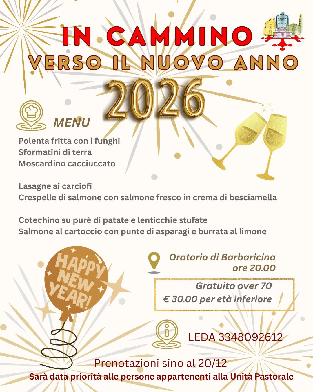 CENA DI CAPODANNO 2026 A BARBARICINA di redazione10 Dicembre 202511 Dicembre 2025Avvento - Natale 2025, In Cammino - Avvisi - Notizie, Oratorio Scarica da qui la versione PDF