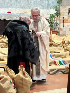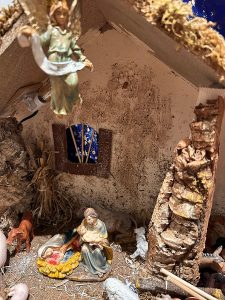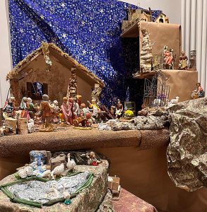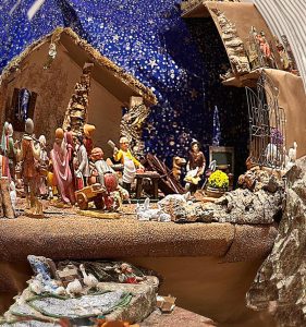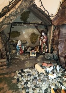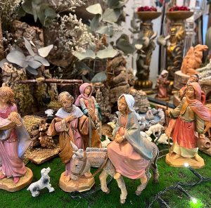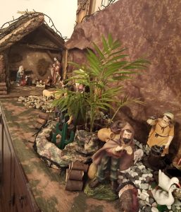 Presepe realizzato a tappe, prima Maria incinta e Giuseppe con l’asina in viaggio verso Betlemme, poi Maria che si riposa dopo aver partorito, Gesù in braccio a San Giuseppe e personaggi vari.