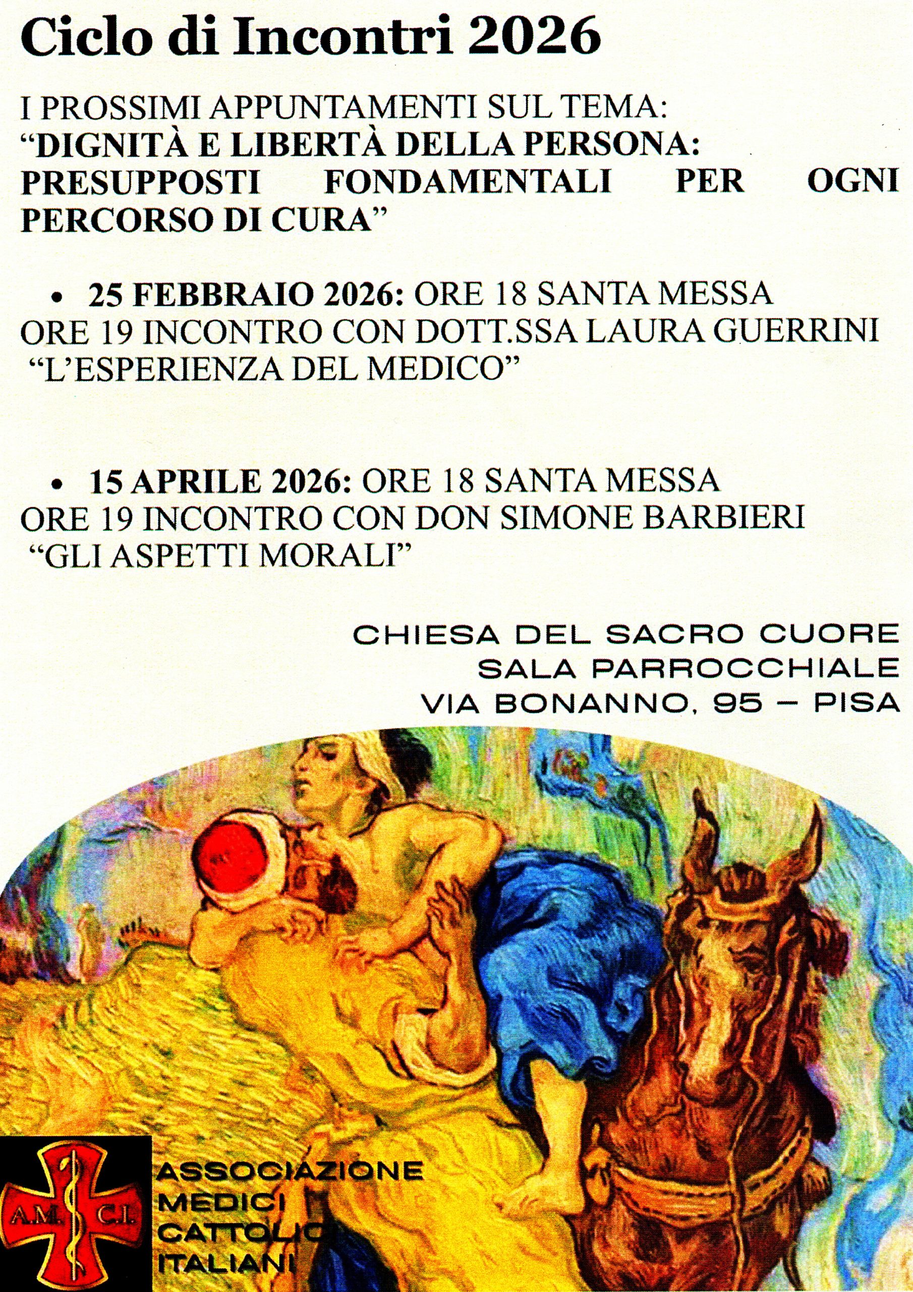 CICLO DI INCONTRI CON L’ASSOCIAZIONE MEDICI CATTOLICI ITALIANI – 25/02 E 15/04 2026 di redazione9 Gennaio 202616 Gennaio 2026In Cammino - Avvisi - Notizie Per la versione PDF cliccare qui
