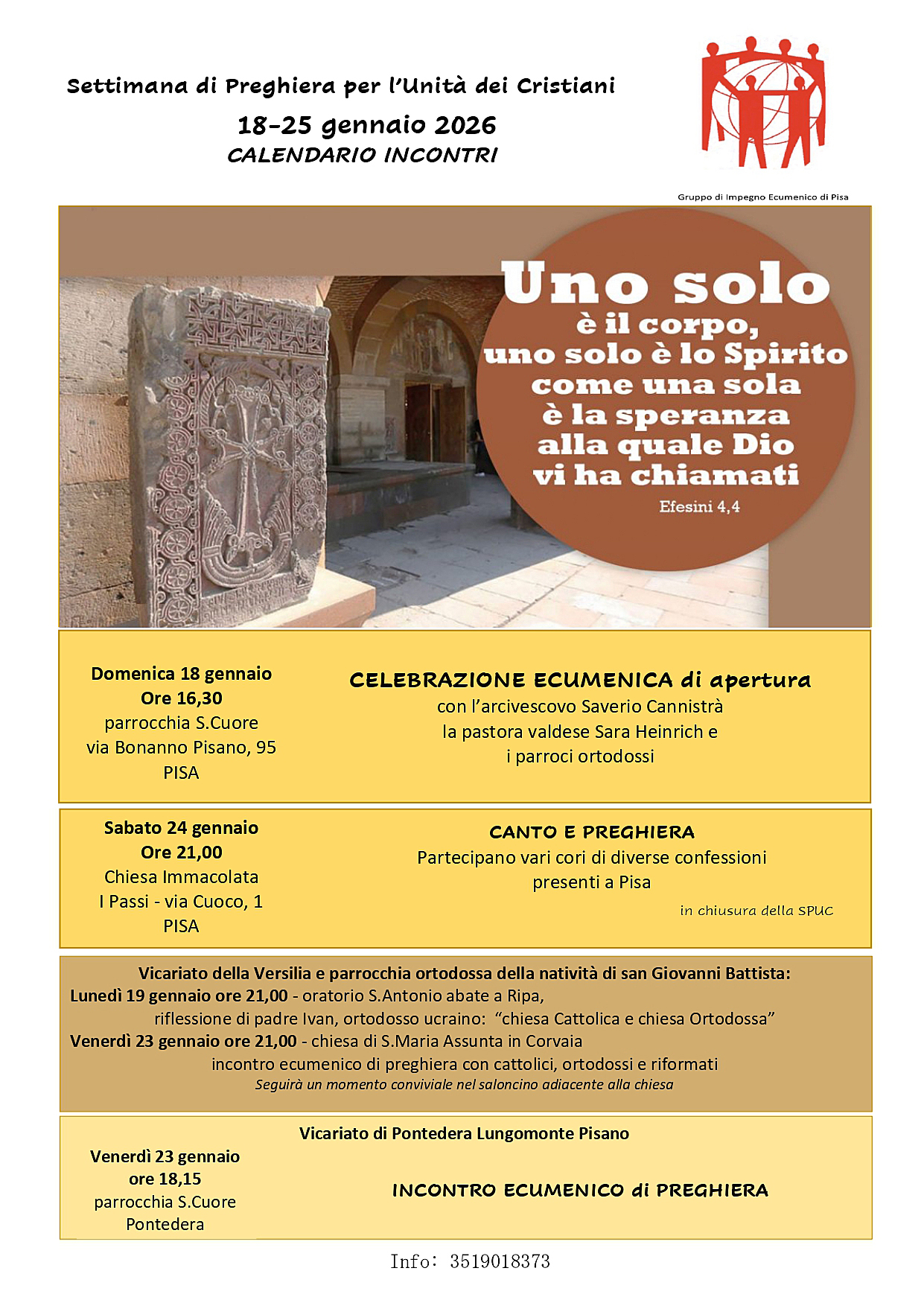 SETTIMANA DI PREGHIERA PER L’UNITA’ DEI CRISTIANI – INCONTRO DEL 24/01/2026 di redazione9 Gennaio 202623 Gennaio 2026In Cammino - Avvisi - Notizie Per la versione PDF cliccare qui Una testimonianza dalla Celebrazione d’apertura del 18 Gennaio Di seguito i cori che parteciperanno alla serata di canto e preghiera Sabato 24/1 a I Passi Per la versione PDF cliccare qui